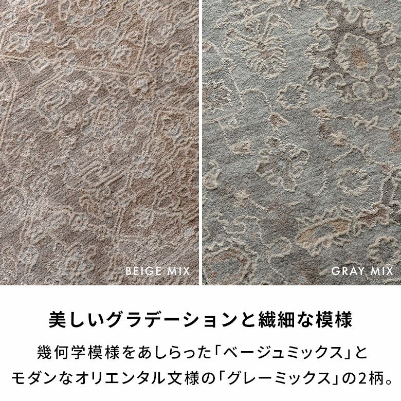 柄はベージュ系カラーのベースにクラシックな幾何学模様をあしらった総柄デザインの「ベージュミックス」と、グレー系カラーのベースにオリエンタル文様をモダンにアレンジしたボーダーデザインの「グレーミックス」の2種類。どちらも敷くだけで空間を格上げしてくれる、繊細で上品なデザインです。