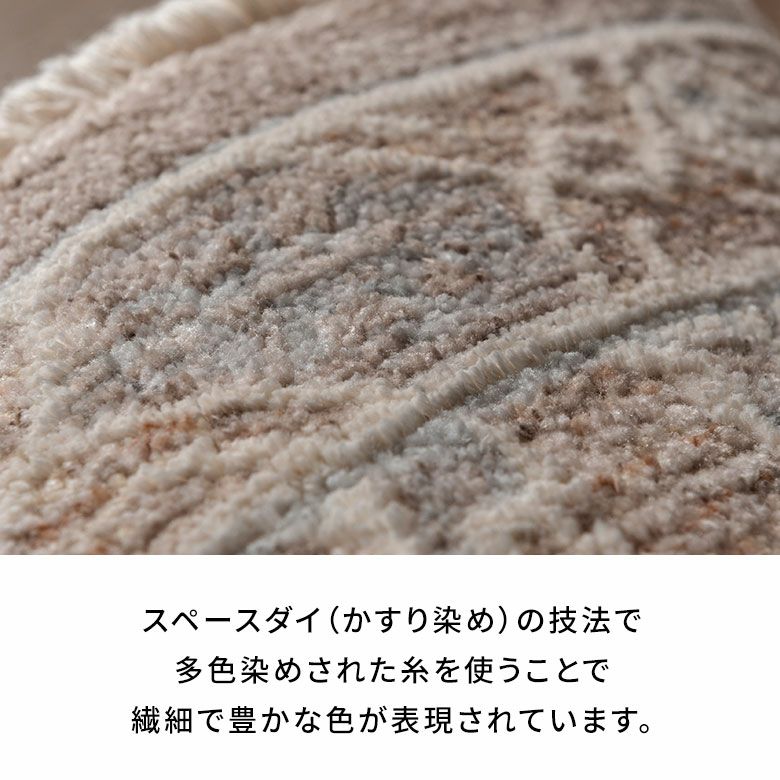 スペースダイ(かすり染め)とは、1本の糸の中で部分ごとに異なる色をランダムに付ける染色方法のこと。これにより、パイルの根元と毛先で色が違ったり、グラデーションになっていたりします。自然なムラ感や複雑な色合いを表現でき、豊かな表情が表れるのが特徴です。