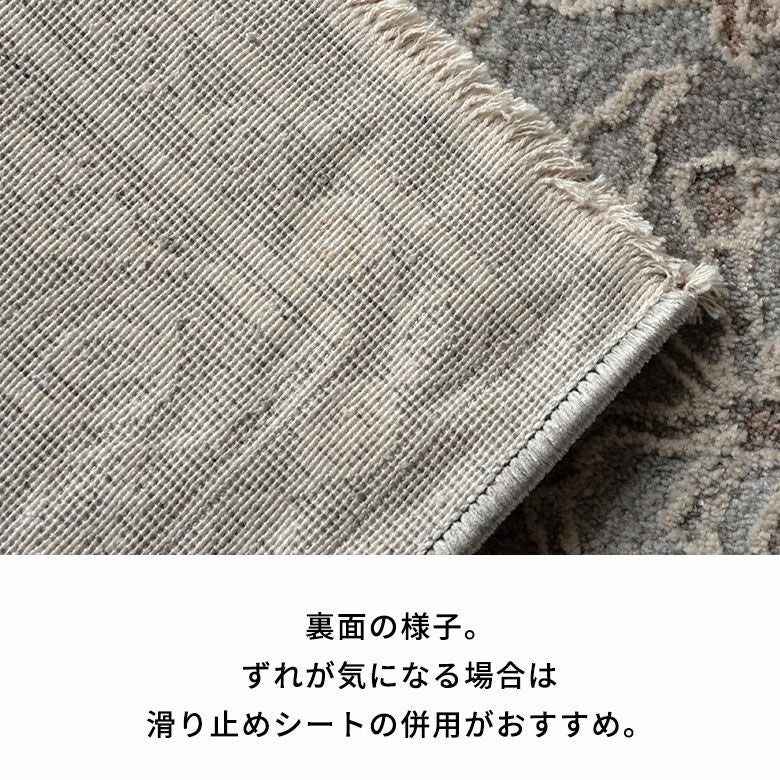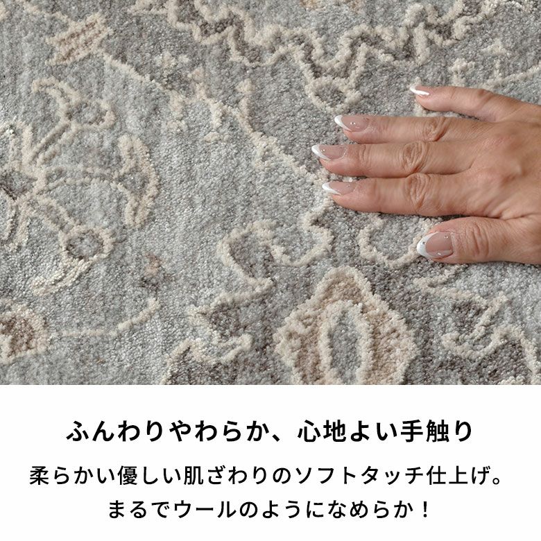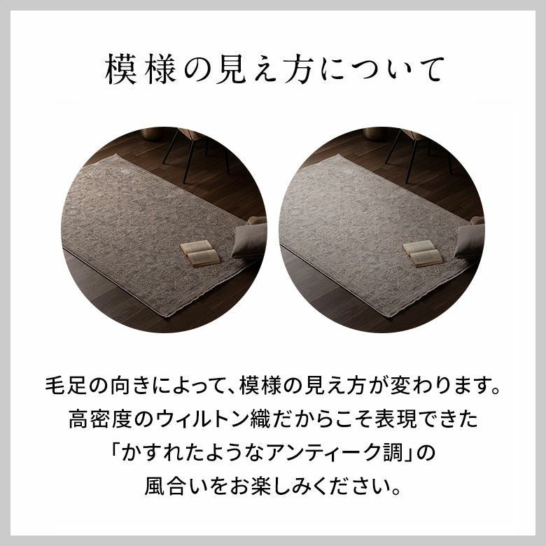 繊細な柄と豊かな色の描写は、糸を贅沢に使ったこのウィルトン織りならではの魅力。パイルの高低差により柄が立体的に描かれ、高級感のある質感です。
