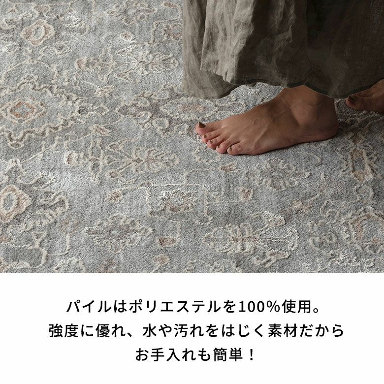 パイルには、なめらかで柔らかいポリエステル糸を使用。水や汚れを弾き、掃除もしやすい抜群の機能性。シワになりにくくタッチは柔らかで、ラグとしての実用性に優れています。また、長期間使用してもへたりにくいというメリットがあります。