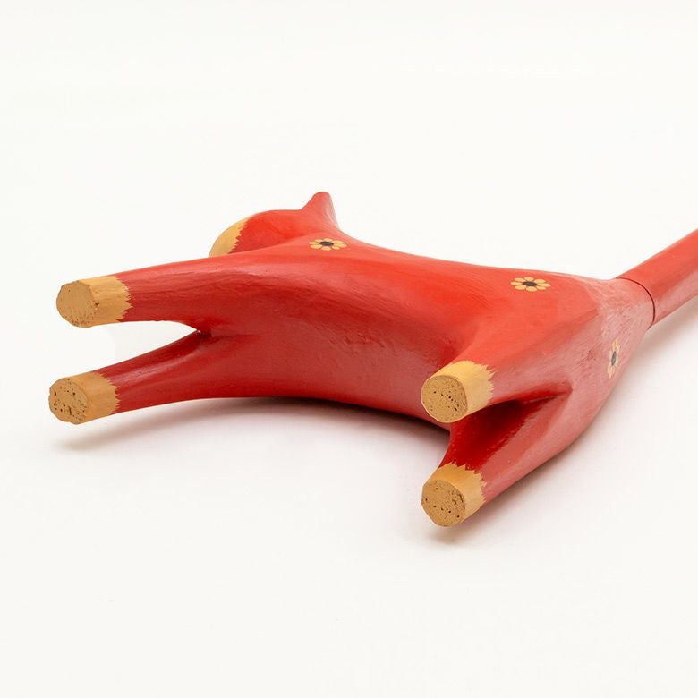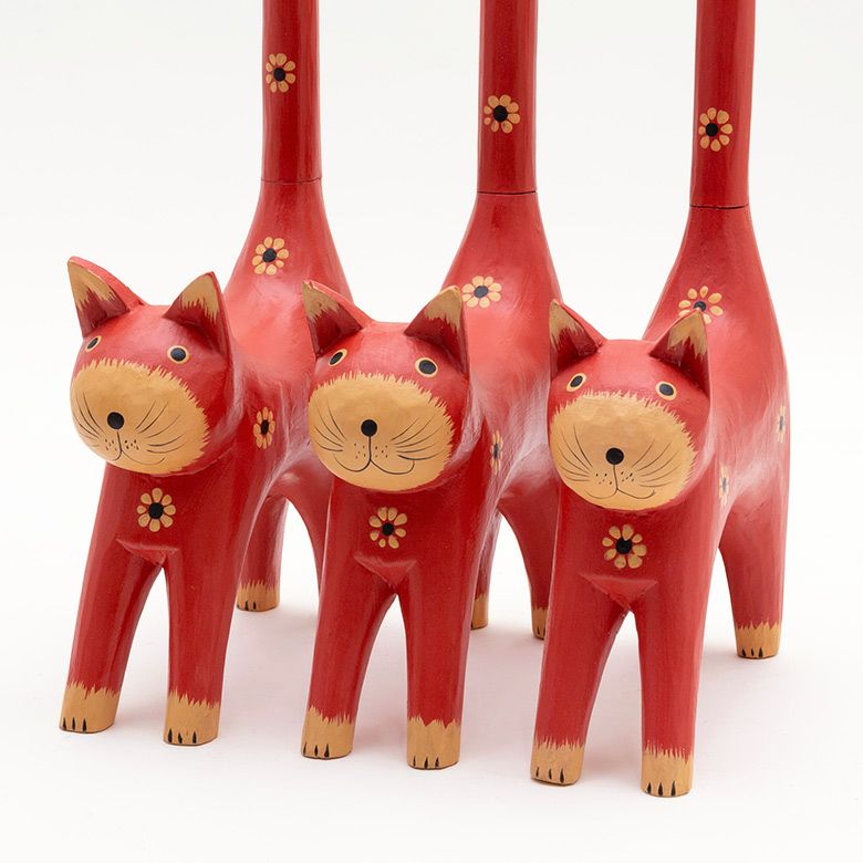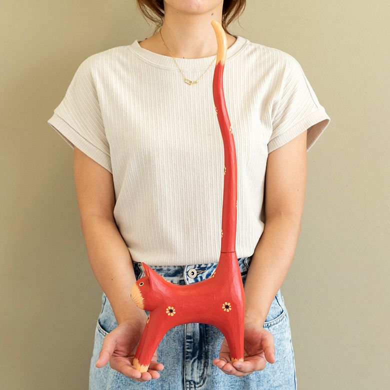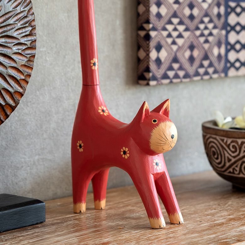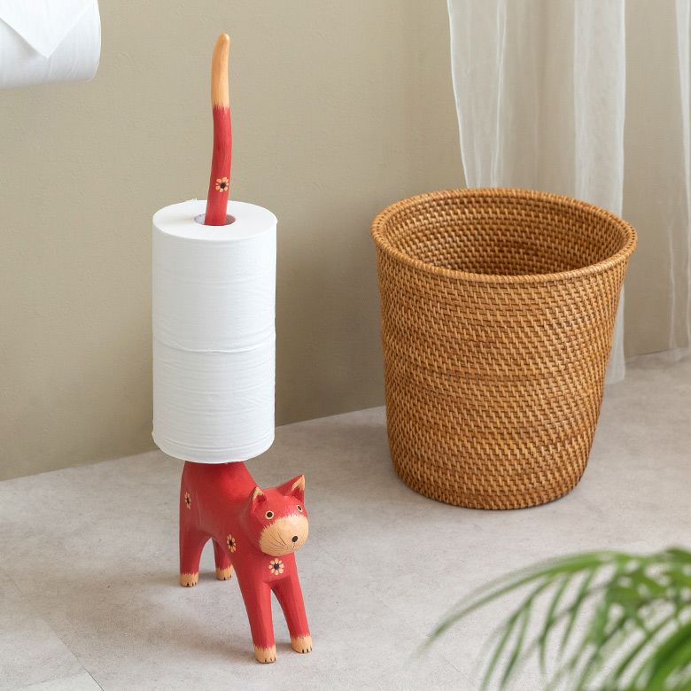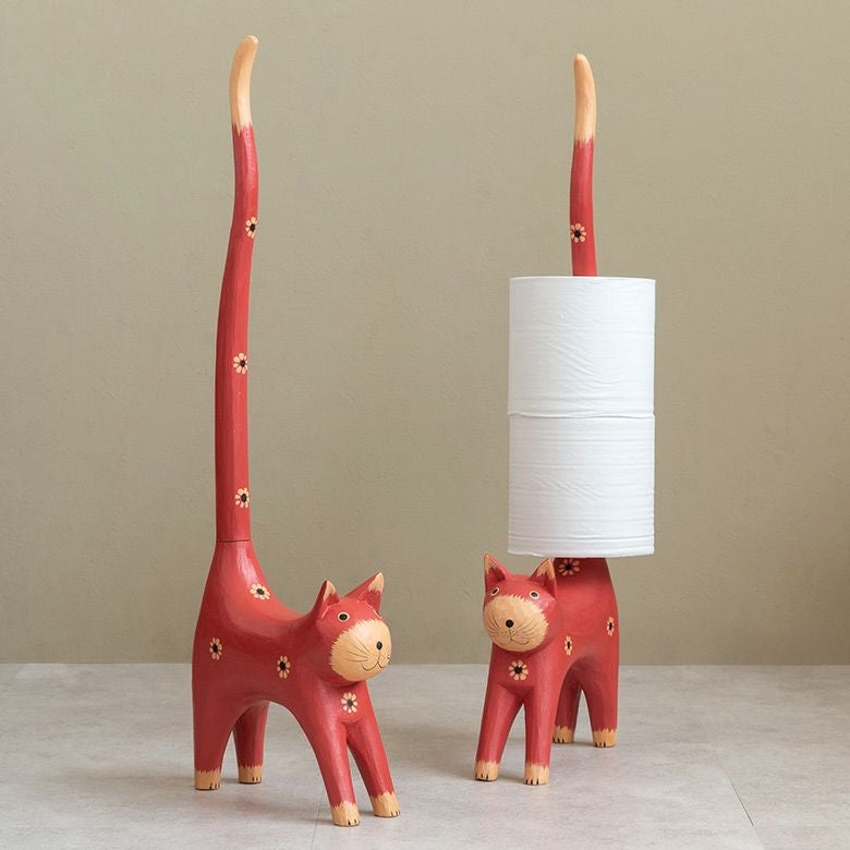 しっぽでトイレットペーパーを持ってくれる木彫りのネコのオブジェ。