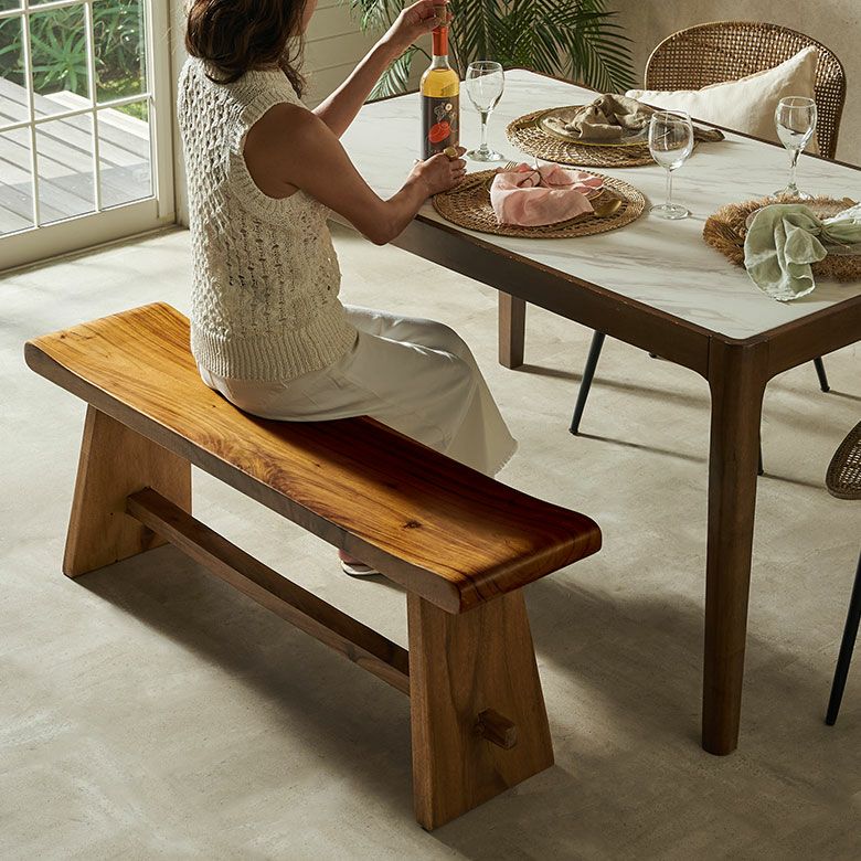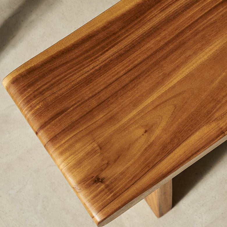 スワールウッドの美しい木目と自然な色合いを活かした、シンプルで存在感のある木製ベンチ。座面の両端に厚みを持たせたゆるやかな曲線が美しいデザイン。
