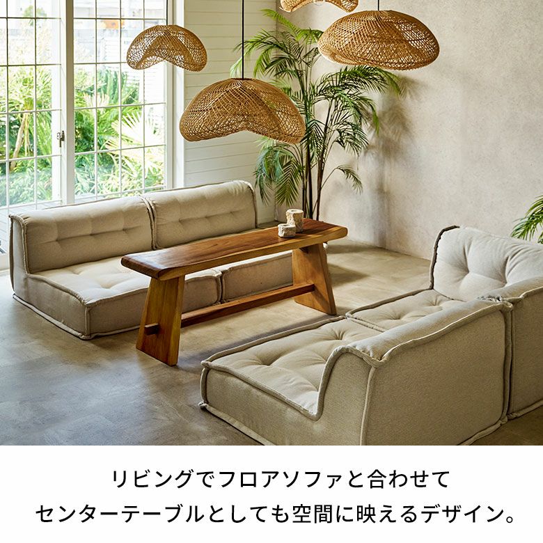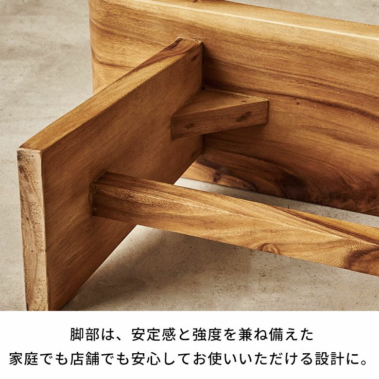 120cmの幅で2~3人がゆったり座れるサイズ感は、ダイニングだけでなく玄関や店舗、ベッドの足元に置くフットベンチとしても活用できる多用途性も魅力。