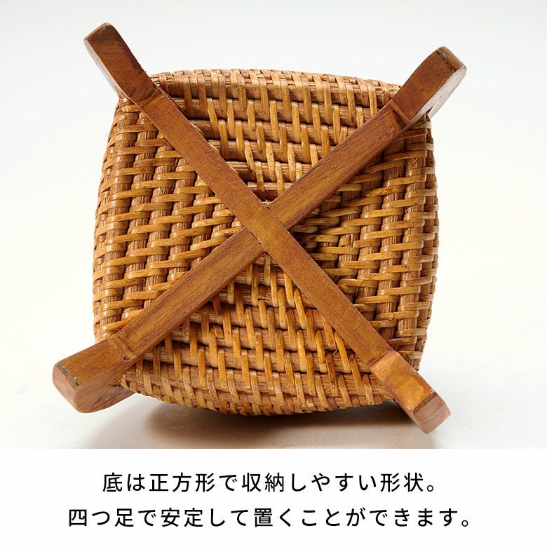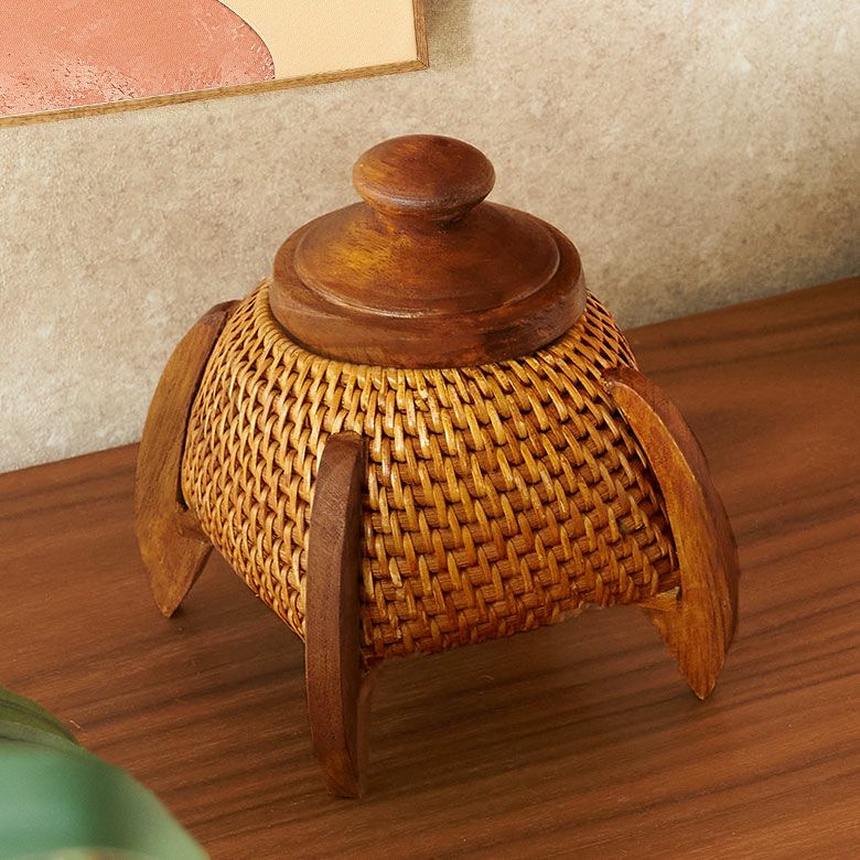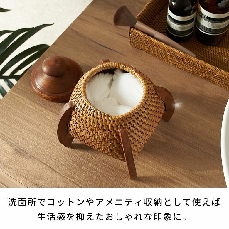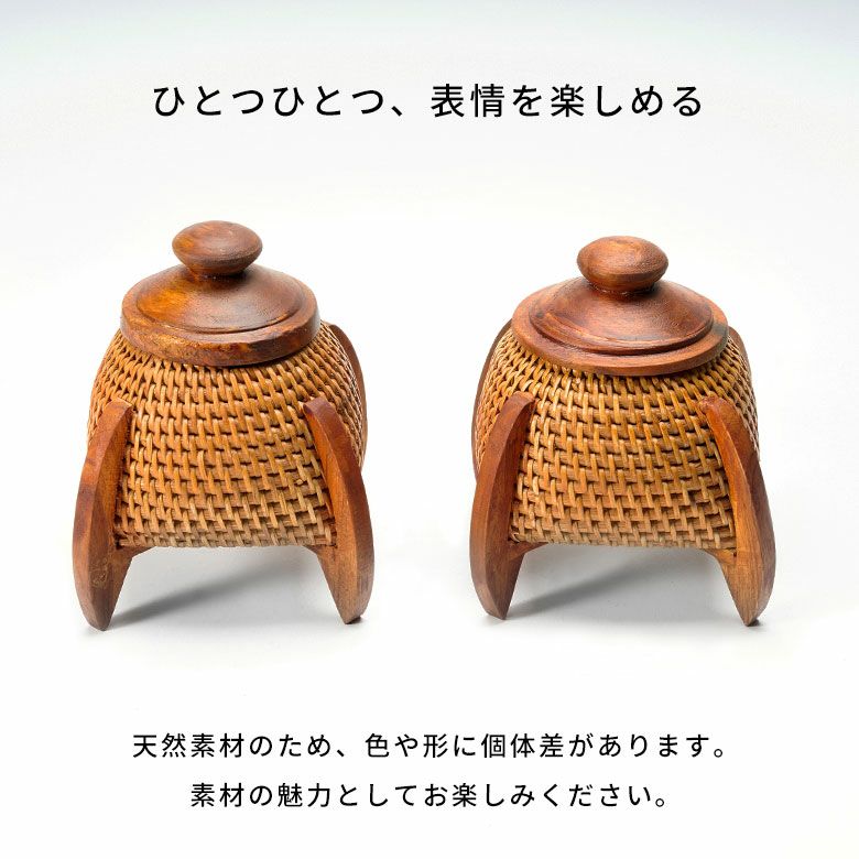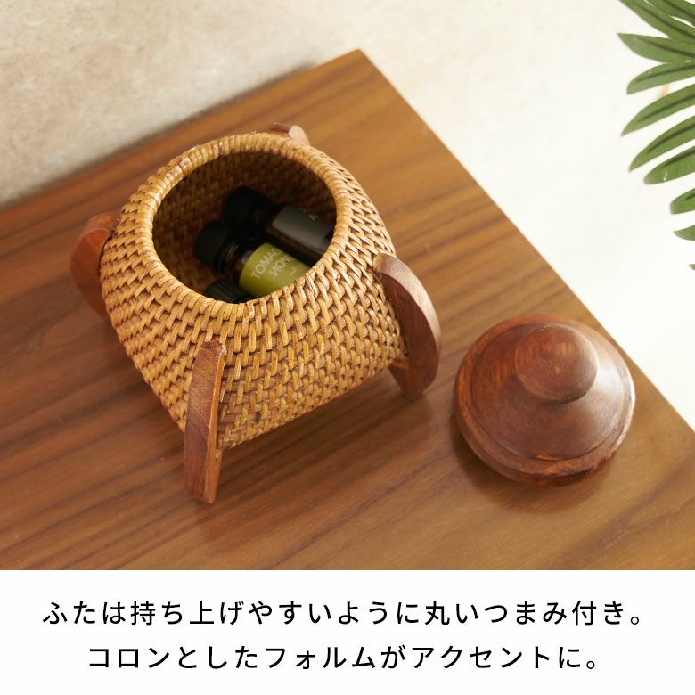 ナチュラルな天然色を生かしながら、太さの異なるラタンを巧みに編み分け、木製の脚とフタを組み合わせたデザインは、まるでロケットのようなユニークな佇まい。コロンと丸みのあるフタはつまみやすく、使い勝手の良さも魅力です。