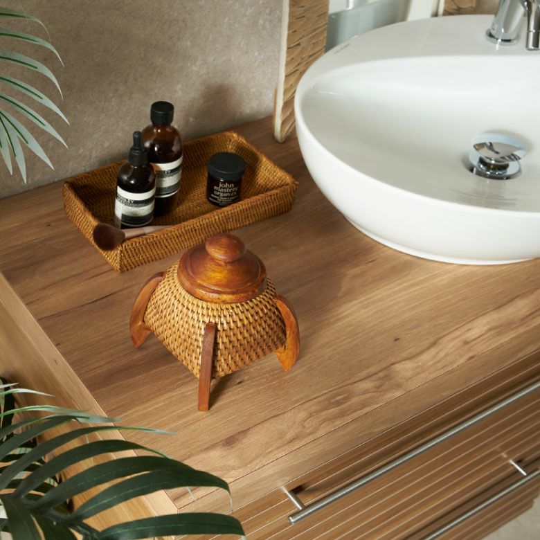 アメニティや小物の収納・ディスプレイとしても活躍。ナチュラル素材ならではの風合いが、南国ムードやリゾート感のある空間づくりにおすすめです。