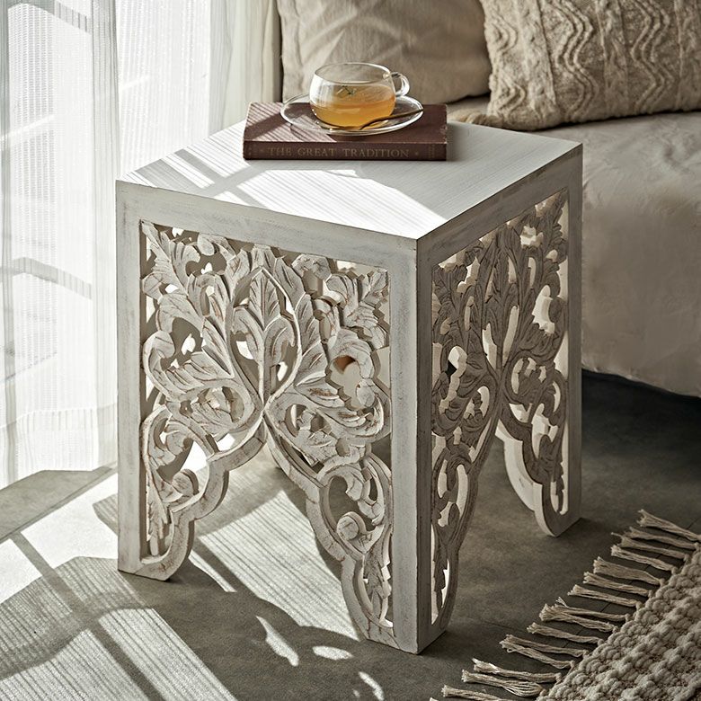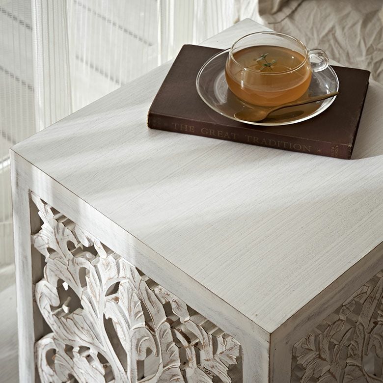 立体感のあるリーフモチーフは、インドの職人さんが一つ一つ手で彫り上げたもの。