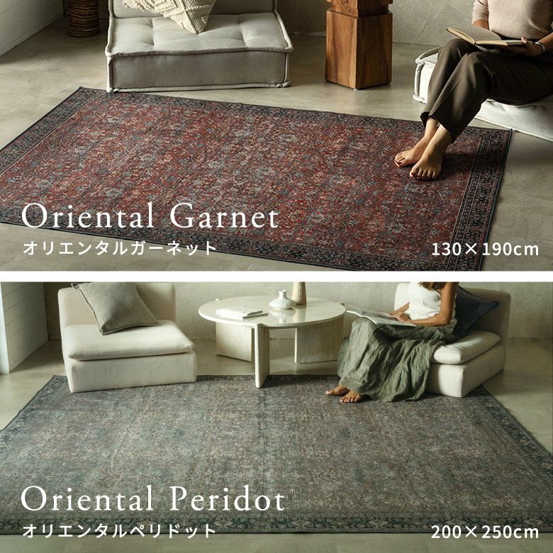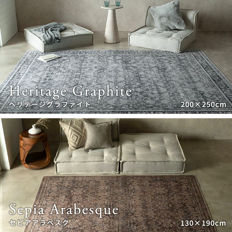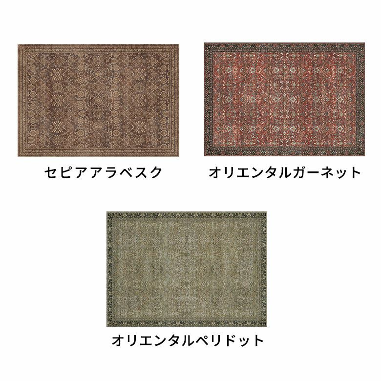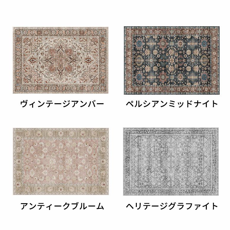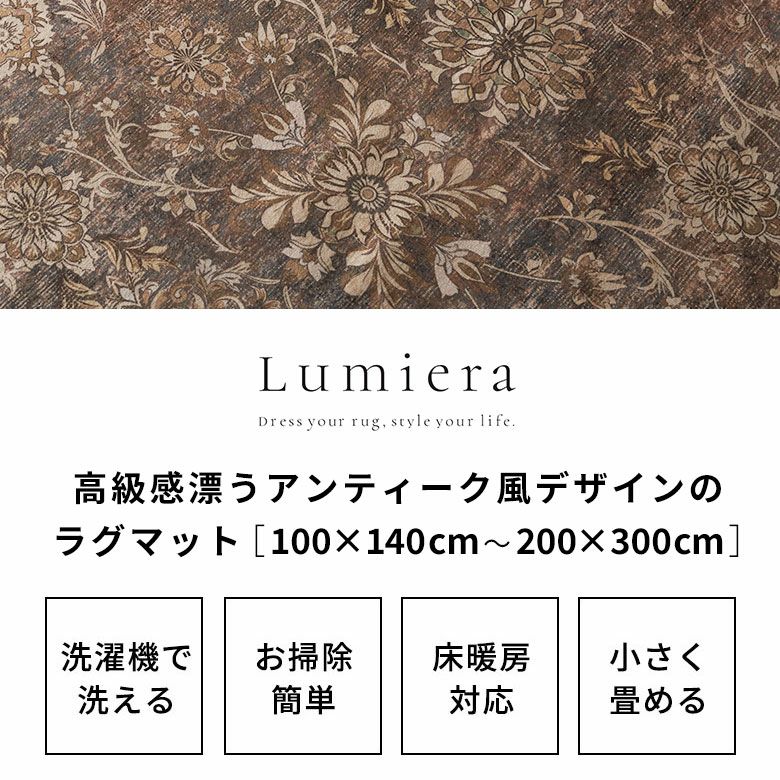 ヴィンテージラグの風合いを“手軽に・清潔に”楽しめるラグマット「Lumiera ルミエラ」シリーズ。繊細な模様と深みのある色合いを転写プリントでリアルに再現し、本物のような重厚感と高級感を実現しました。