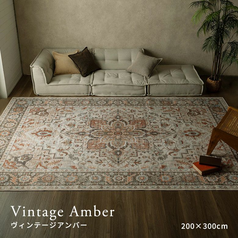 アイボリーやベージュを基調に、ブラウンやテラコッタをアクセントに組み合わせた、ヴィンテージ感のあるデザイン。中央の花形メダリオンが存在感を放ち、周囲の唐草や小花の文様が上品な華やかさを添えています。 天然素材の編み込みチェアやウッドテーブルなどアジアンテイストのインテリアと好相性。