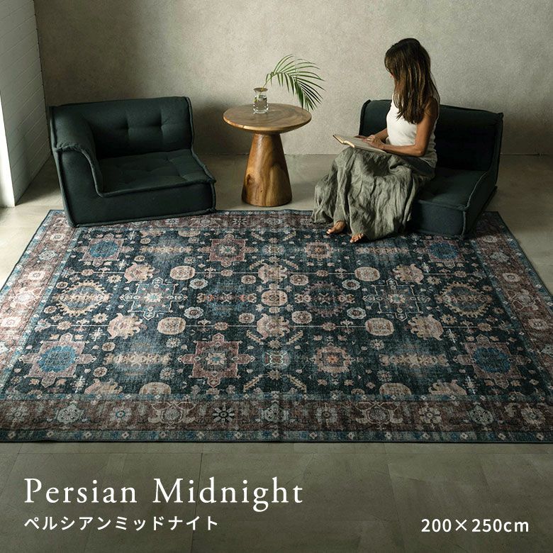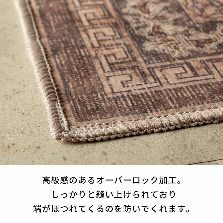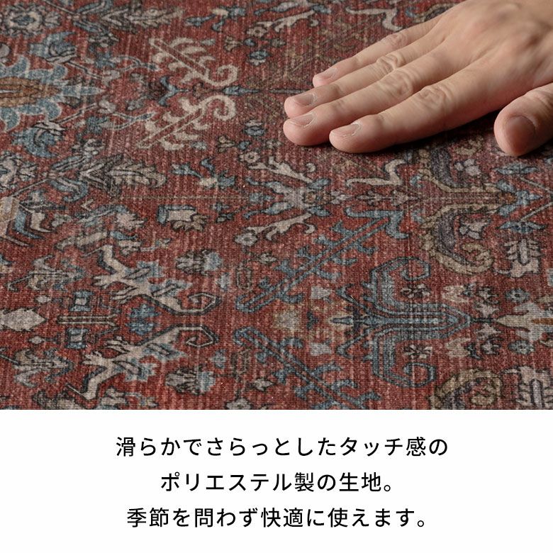 本物のヴィンテージラグのような、かすれや色ムラまで美しく再現。転写プリントならではの繊細な柄と深みのある発色で、お部屋を上品に彩ります。落ち着いたトーンと高級感のあるデザインが、インテリアに自然になじみます。