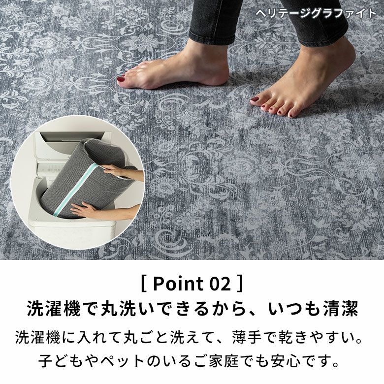 薄手で軽く、お掃除もしやすいから毎日快適。さらに洗濯機で丸洗いできるので、子どもやペットのいるご家庭でも安心してお使いいただけます。床暖房・ホットカーペット対応で、季節を問わず一年中使えるのも嬉しいポイント。一枚敷くだけでお部屋の印象が変わる、手軽に取り入れられるデザインラグです。