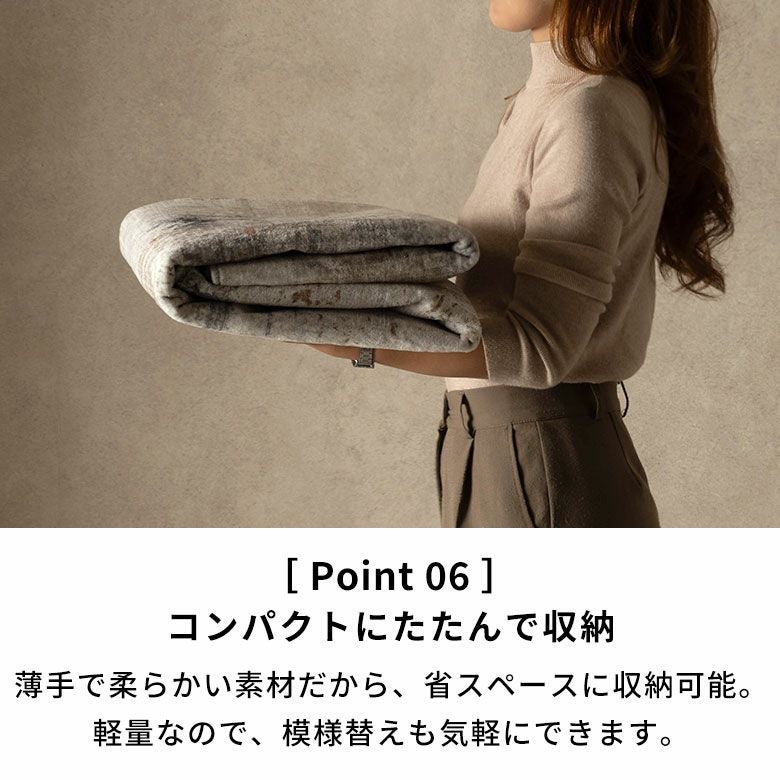 薄手で柔らかい素材だから、畳んで省スペースに収納できます。130×190cmサイズでもこんなにコンパクトに!さらに軽量なので、季節や気分で模様替えしたいときにも手軽に入れ替えできます。洗い替え用に柄違いを揃えるのもおすすめです。