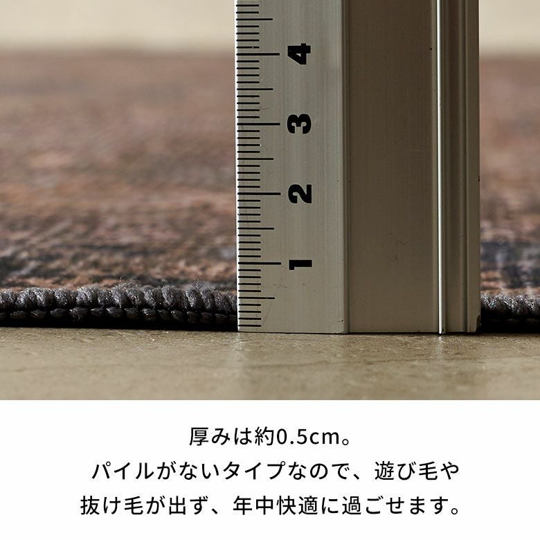 薄手でお手入れ簡単 厚みは約0.5cm。パイルがないタイプなので、遊び毛・抜け毛が出ず、年中快適に使えます。 |