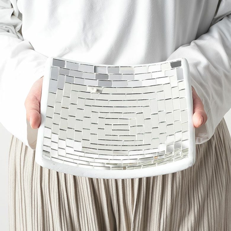 ハンドメイドの素朴な温かみを感じるミラータイルデコレーションプレートは、色をあえて使用していないので、いろんなオブジェとの組み合わせができます。 お花などを飾ってアジアンオブジェとして飾っていただいたり、小銭や鍵、アクセサリーなどを入れていただけば、おしゃれな小物入れとしてもお使いいただけます。 四角いシンプルなデザインで、底から丸みを帯びたやわらかなカーブがお部屋でも存在感を放ちますよ。