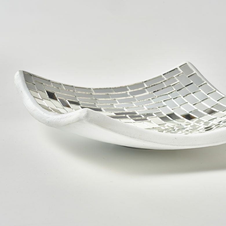 厚みのある白い陶器の表面にミラーを モザイクタイルのように並べて貼り付けたプレートは