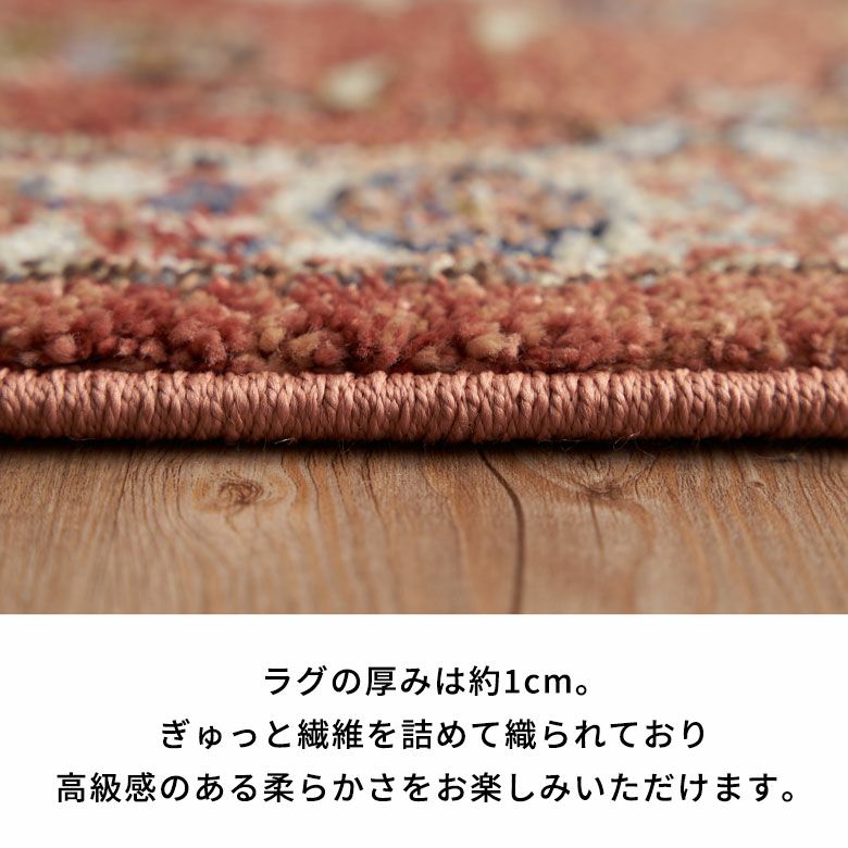 ラグの厚みは、毛足が寝ている状態で約1cmです。(※毛足の方向により異なります)