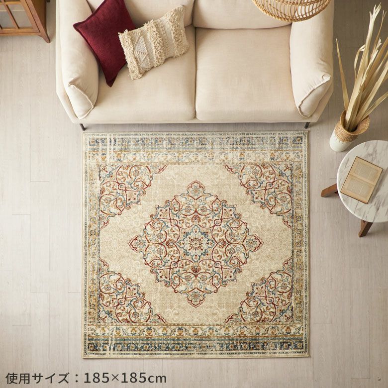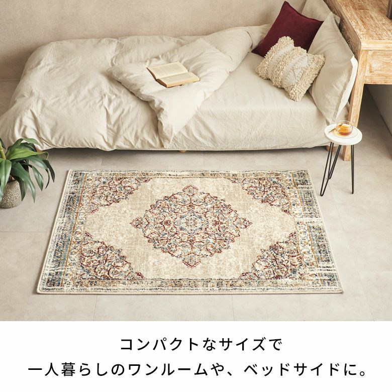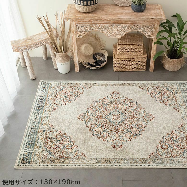 空間を素敵に演出する鮮やかなベースカラーとメダリオンデザイン。1枚取り入れるだけでナチュラルインテリアの良いポイントになってくれます。