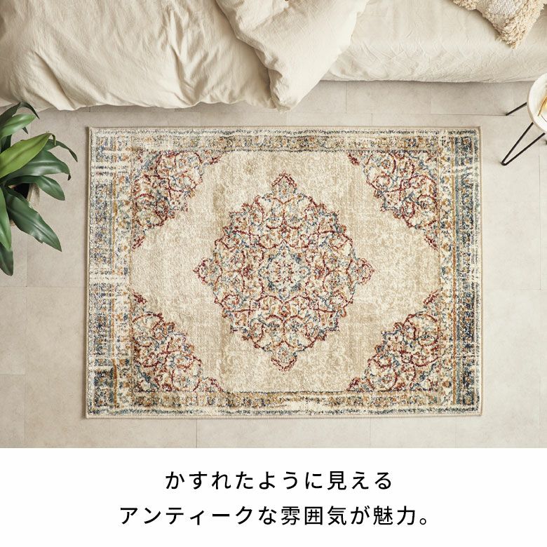 「高密度ウィルトン織」の魅力を活かし、かすれたようなアンティーク感を表現しました。短めの毛足ですが、ふんわりやわらかく心地よい感触。リビングでもダイニングでも、そしてオールシーズン活躍すること間違いなしのラグカーペットです。