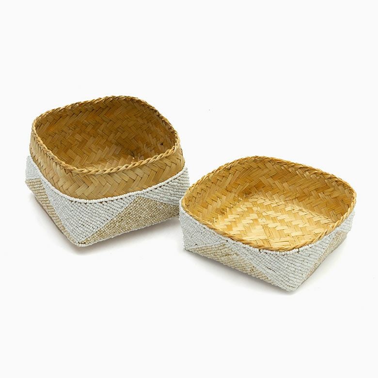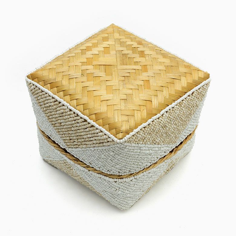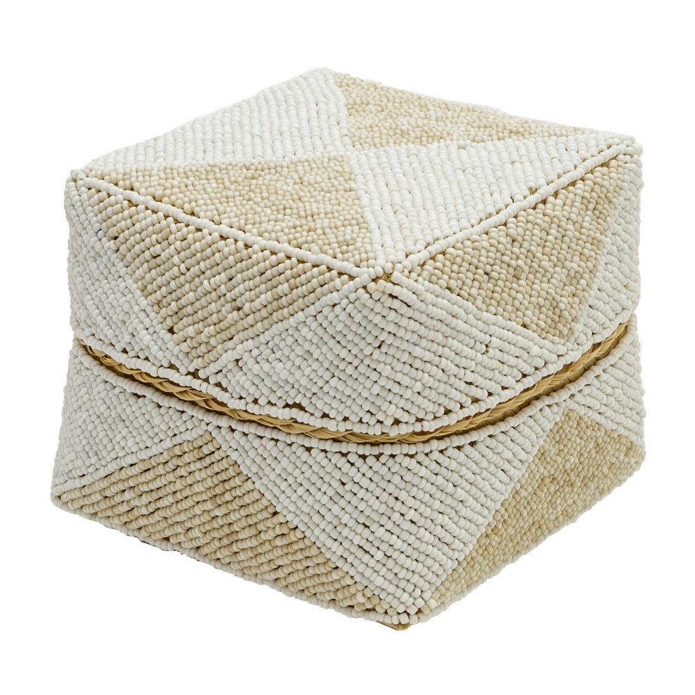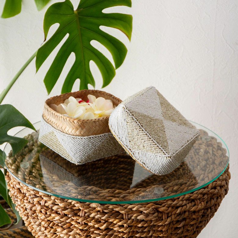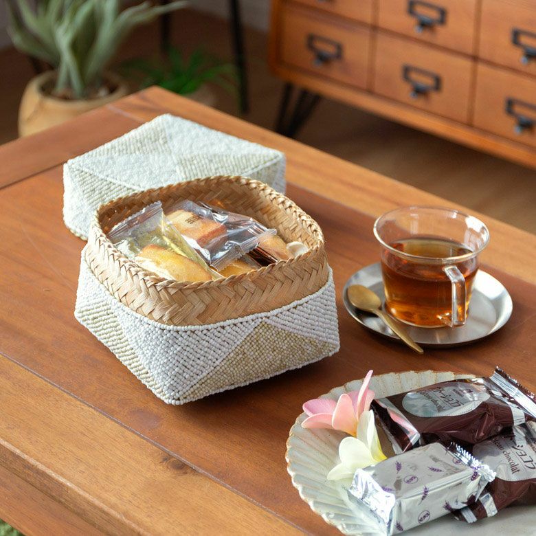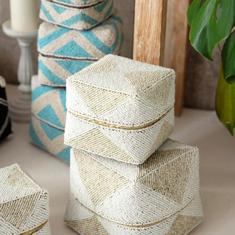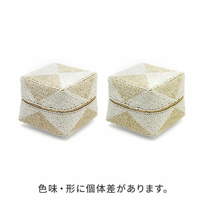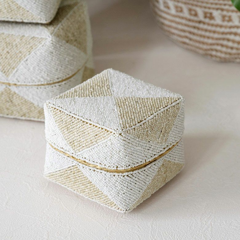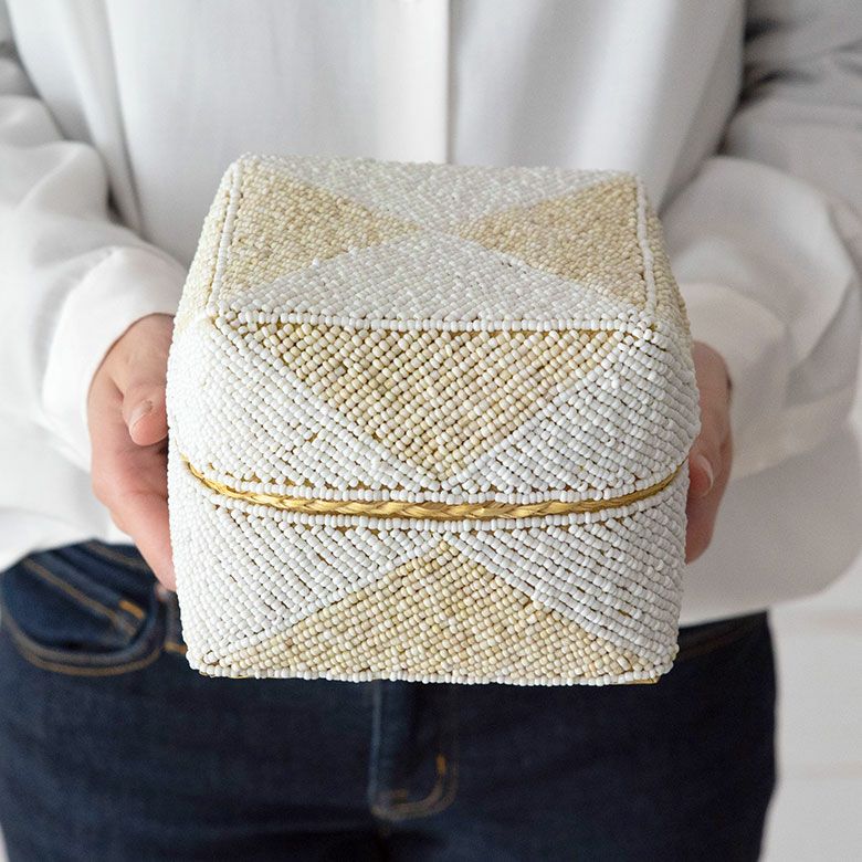 小物入れ 小物収納 アクセサリーケース フタ付き インスタ映え 小さ目 小箱 ソカシ ビーズ製 ダイヤ柄 17×17cm 白×ベージュ[13535-m] 【 収納ケース 収納ボックス ギフトボックス 蓋付き 蓋付き収納 フタ付き ディスプレイ デコレーション ギフトボックス プレゼント おしゃれ 可愛い アジアン 雑貨 アジアン雑貨 バリ島 バリ雑貨 リゾート 】