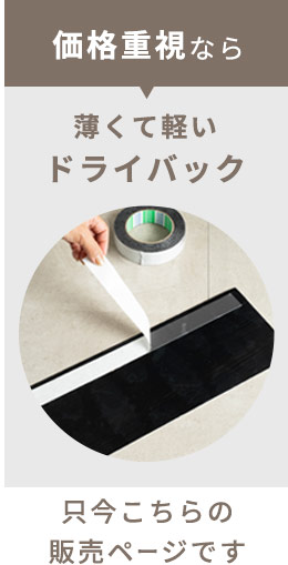 施工方法はこちらのシリーズ最安値「ドライバックタイプ」だけで なく、置くだけでピタッと吸着する接着剤不要の「置くだけタイプ」、接着剤があらかじめ塗られた「シール式タイプ」の3種類からお選びいただけます。