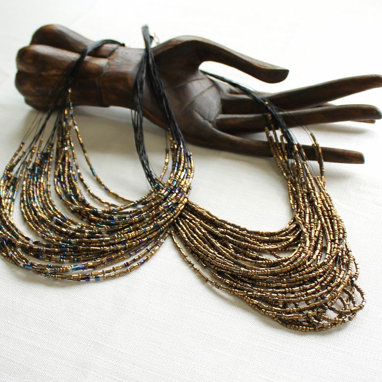コードに通したビーズを何連にも重ね合わせたエスニックなネックレス。
