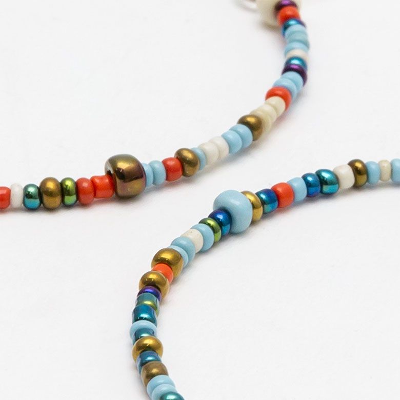 ブルーやレッド、ゴールドなどカラフルなビーズを使用。