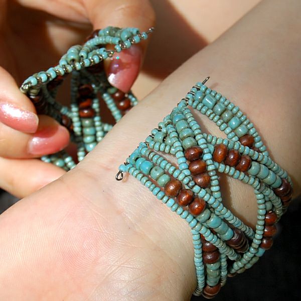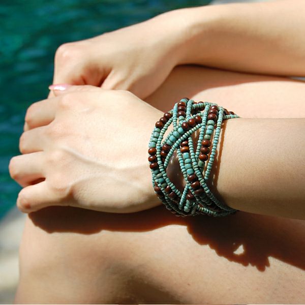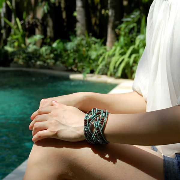 | バリ島の職人が細かなビーズを敷き詰めて一つ一つ丁寧に編み込んで出来た手間暇かけたアジアンバングル。 ビーズひとつひとつにバリ島の雰囲気が伝わってきます。中に木製のビーズをアクセントとして取り入れ、つなぎ合わせた ビーズ同士をクロスさせて作り上げたバリニーズの感性が伝わるアクセサリーになっております。 涼しげな服装とマッチするバングルをひとついかがですか? | ||||