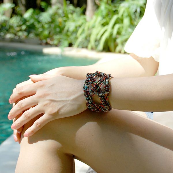 | バリ島の職人が細かなビーズを敷き詰めて一つ一つ丁寧に編み込んで出来た手間暇かけたアジアンバングル。 ビーズひとつひとつにバリ島の雰囲気が伝わってきます。中に木製のビーズをアクセントとして取り入れ、つなぎ合わせた ビーズ同士をクロスさせて作り上げたバリニーズの感性が伝わるアクセサリーになっております。 涼しげな服装とマッチするバングルをひとついかがですか? | ||||