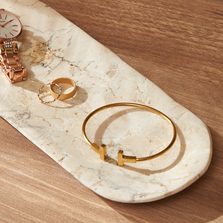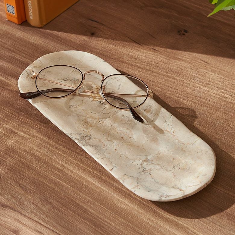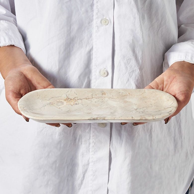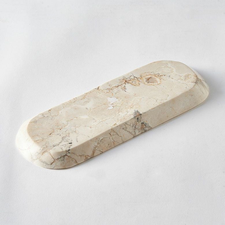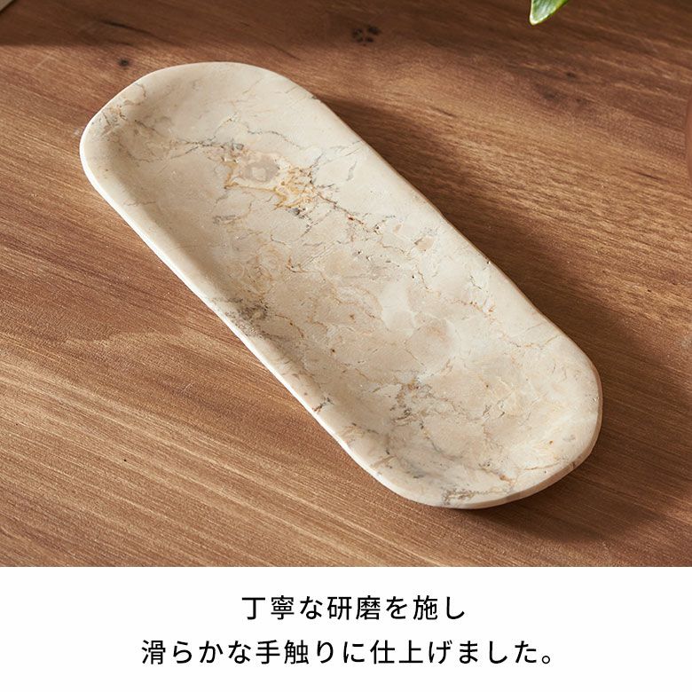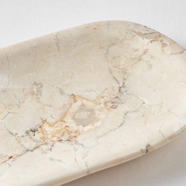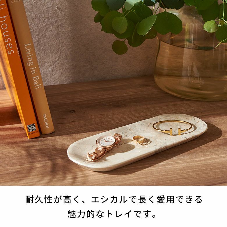 アイボリーを基調としたマーブル模様と、天然大理石ならではの重厚感と美しさが、高級感漂う雰囲気をプラス。耐久性が高く、エシカルで長く愛用できる魅力的なトレイです。
