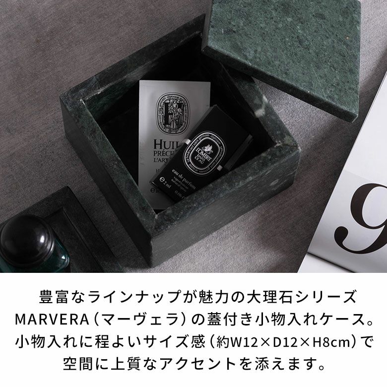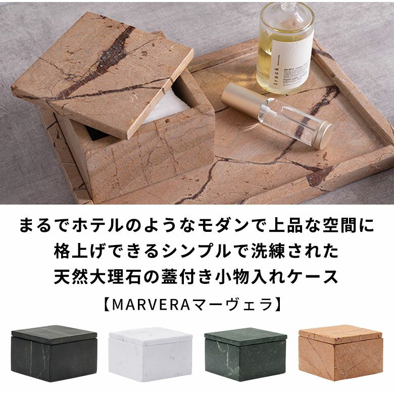 豊富なラインナップが魅力の大理石シリーズ、MARVERA(マーヴェラ)の蓋付き小物入れケース。世界有数の大理石産地として知られるインドの天然大理石を贅沢に使用し、熟練職人がひとつひとつ丁寧に手作業で仕上げることで、素材本来の重厚感や温もり、そして自然が生み出す唯一無二の美しい表情を引き立てています。