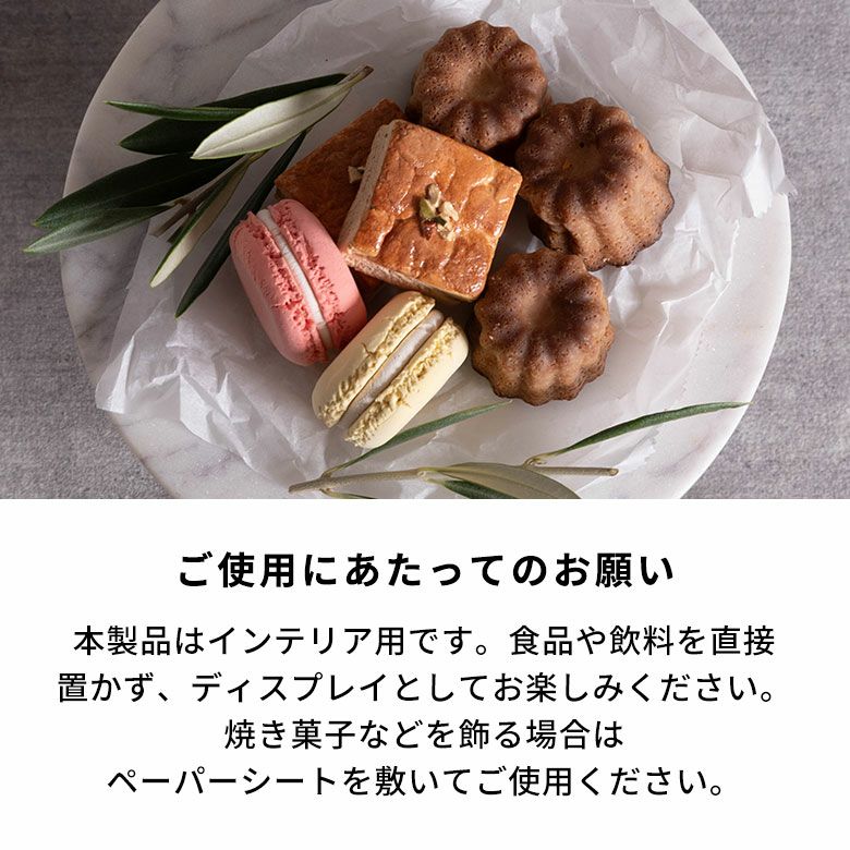 本製品はインテリア用です。食品や飲料を直接置かず、ディスプレイとしてお楽しみください。焼き菓子などを飾る場合は、ペーパーシートを敷いてご使用ください。