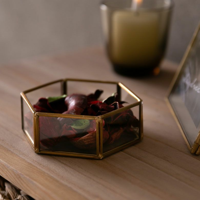 六角形の真鍮製フレームで、側面と底面はガラス張りです。