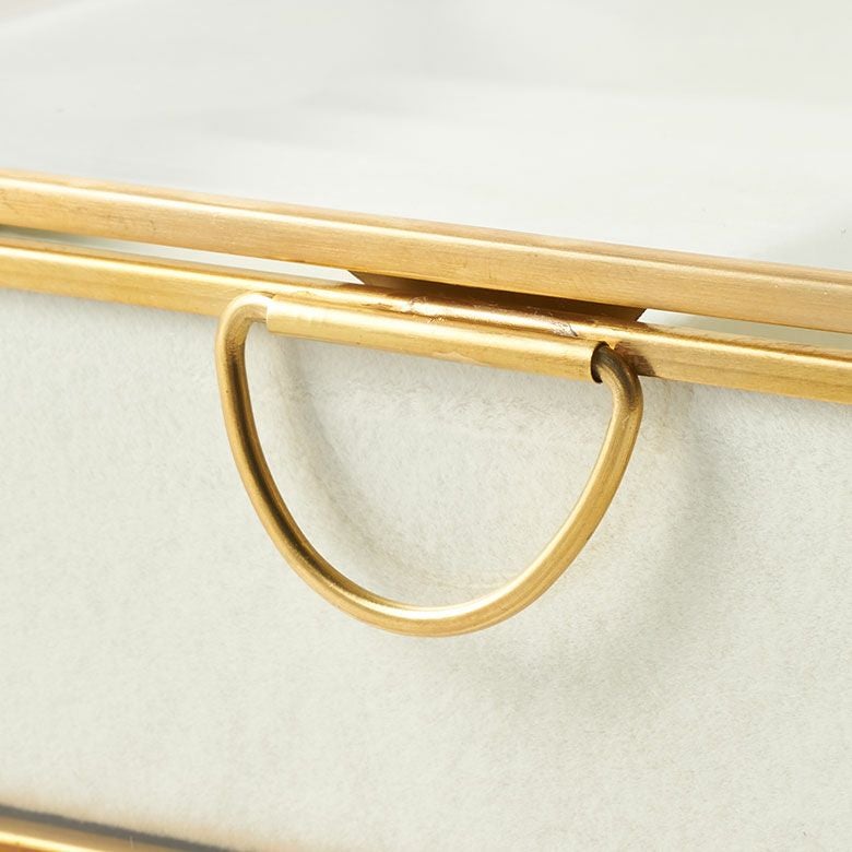 大人気のガラスと真鍮のドロワー型ケースに、新たにベロア調のアクセサリートレイをつけてリニューアル。さらに上品に、さらに使いやすくグレードアップしたジュエリーボックスです。真鍮のゴールドがよく馴染むアジアンやBOHOスタイルはもちろん、ガラスと真鍮が醸す上品な雰囲気はリゾートインテリアやホテルライクな空間にも。