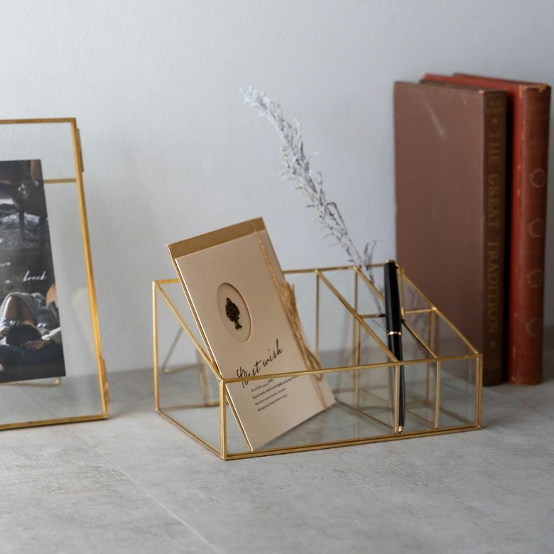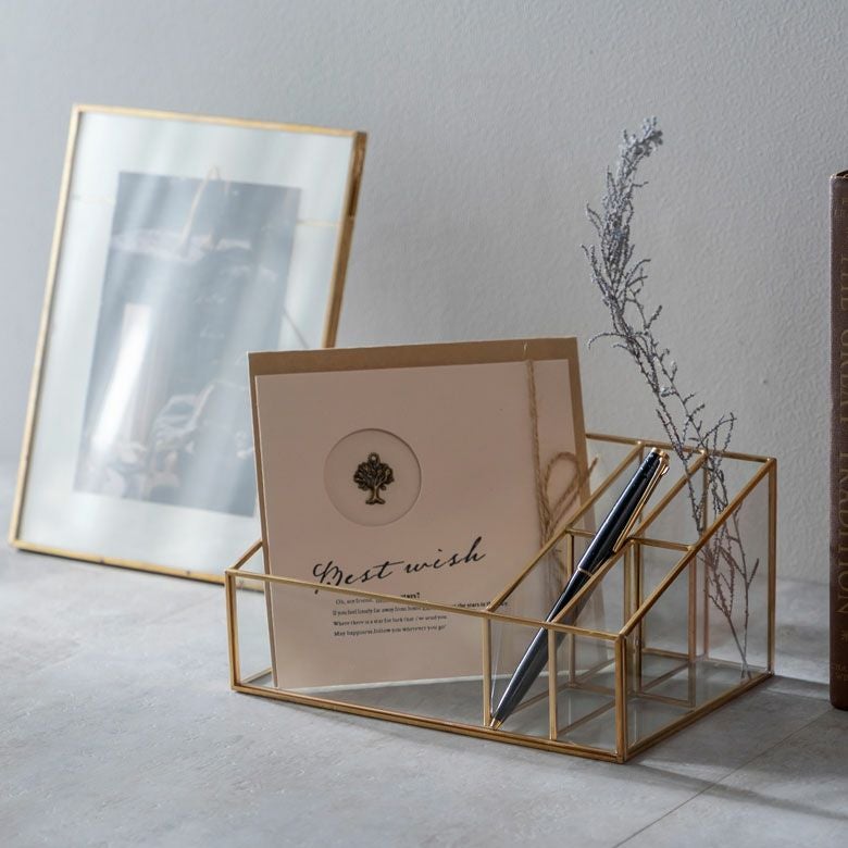 ガラスの透明感とゴールド色のフレームが上品で落ち着いた印象の