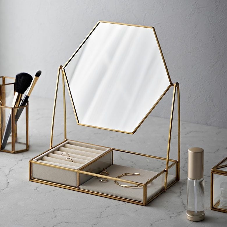 スタイリッシュな印象をプラスする六角形のミラーは角度調節が可能。