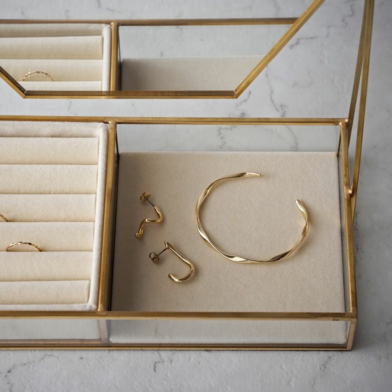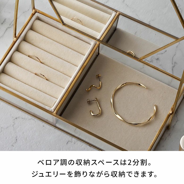 柔らかい素材で優しくジュエリーをしまえるベロア調の2分割の仕切り。