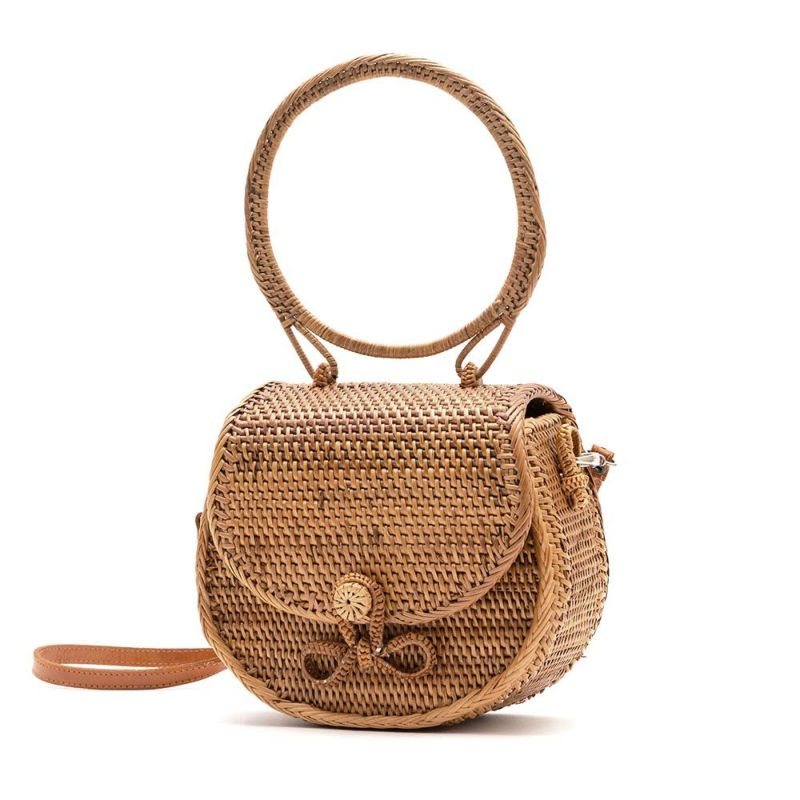 天然素材アタで編まれたハンドバッグは、独特の色合いと細かい編み目が特徴。