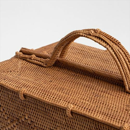 フタの端についたループをカゴのサイドの突起にひっかけて留めます。 |