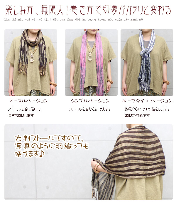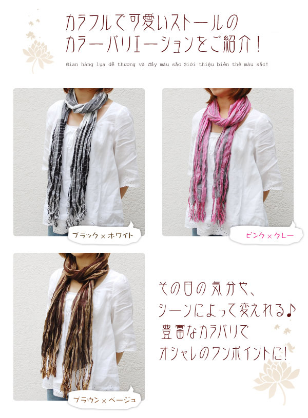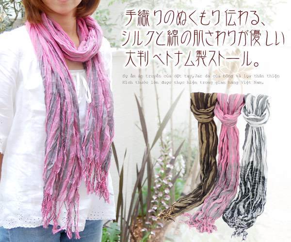 ベトナムシルクと綿を使用した肌さわりが優しいストール。 ストール自体に、クリンクル加工(しわ加工)を 施して、よりふんわり軽く仕上げました。 綿を使用しているので、ゴワつかず、肌にとっても 気持ちいいのでずっとつけていたいぐらい♪ カラーは3色ですが、それぞれに色の配色が 絶妙でアジアンチックな雰囲気を楽しめる ストールになっています。