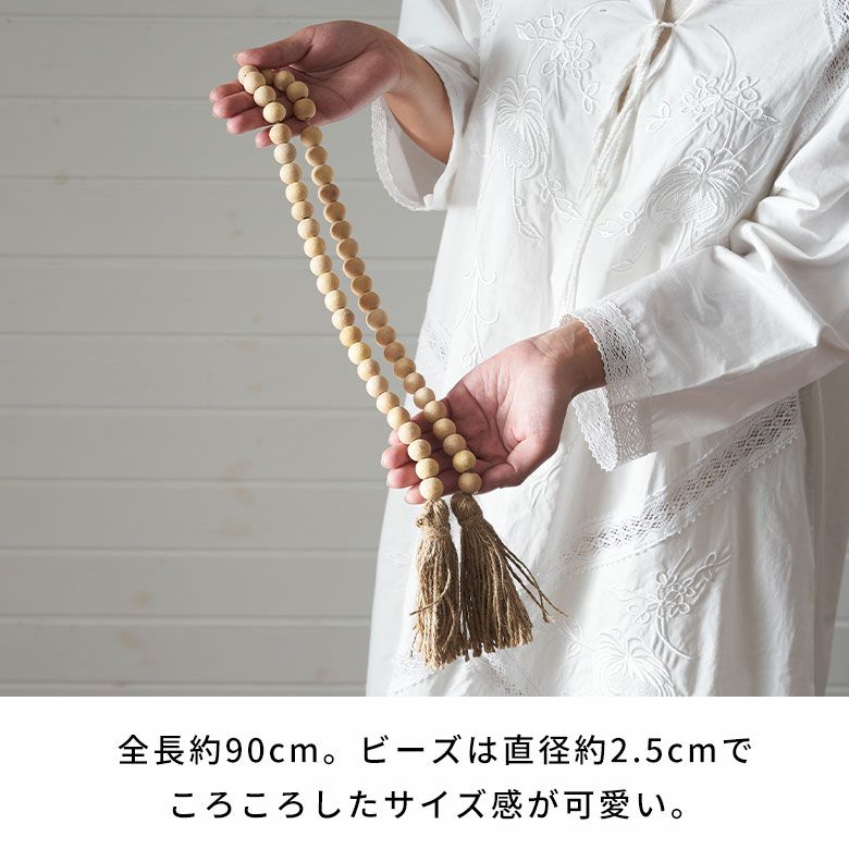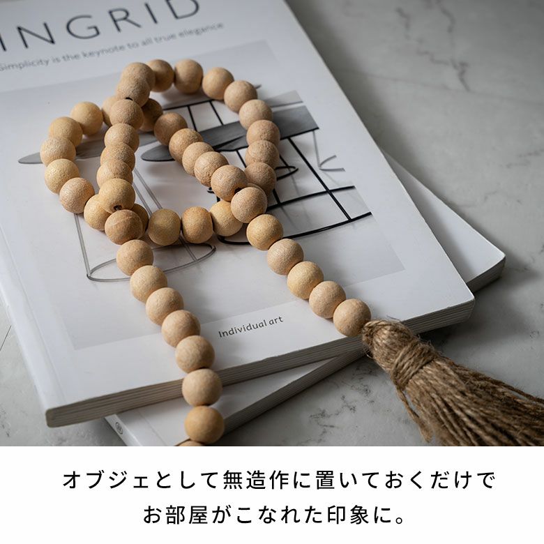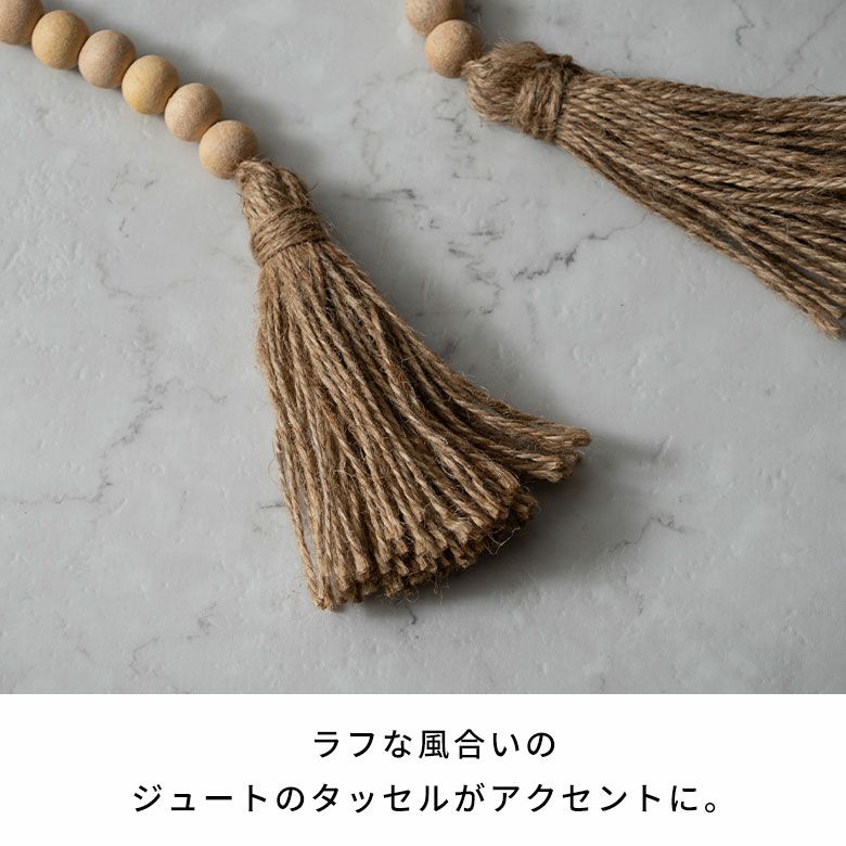 天然木のビーズにジュートのフリンジがアクセントになったガーランド。