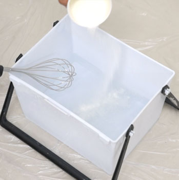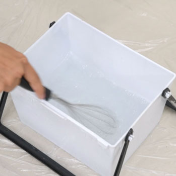 1. バケットの中に、必要な分量の糊を作ります。目安として輸入壁紙を1本貼るのに、1.4リットルの水に70gの粉糊を溶かします。