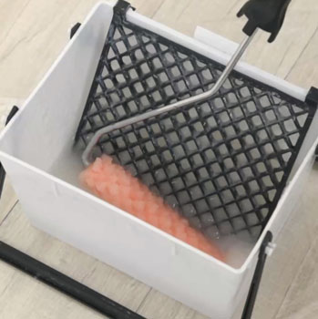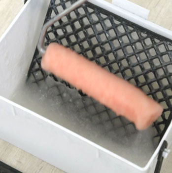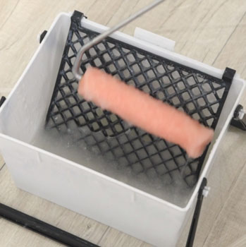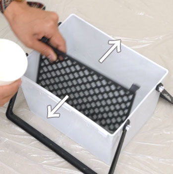 1. バケットにネットを取付けたら、ローラーを糊にドボンと付けます。 |