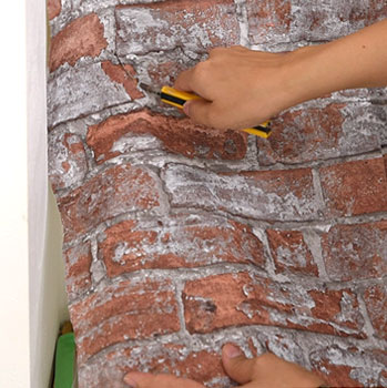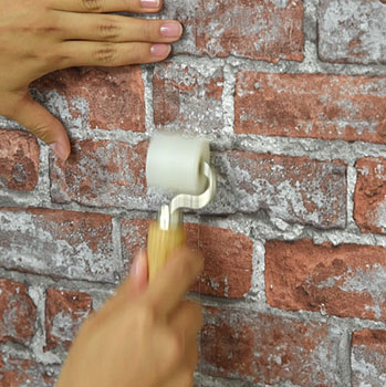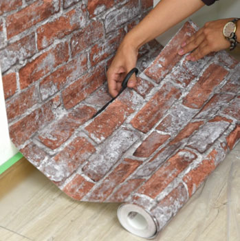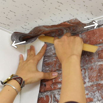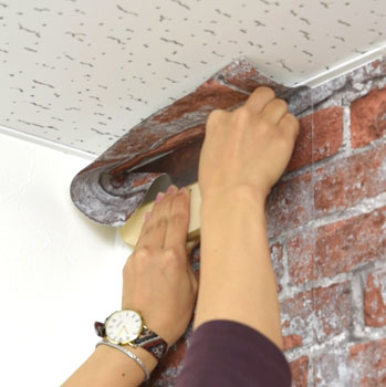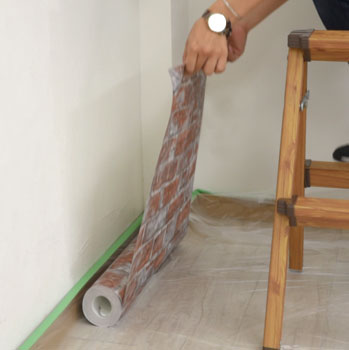 6. 壁紙のロールを床に置き、脚立に乗りながら天井までスルスルと広げます。(※壁紙によっては、柄の向きが逆になる場合があります。) |