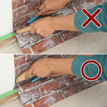Point 2. 上はよくある間違った切り方です。これでは地ベラの刃の厚み分、隙間が空いてしまいます。下のように、地ベラを当てた外側にカッターを添えて切ります。 |