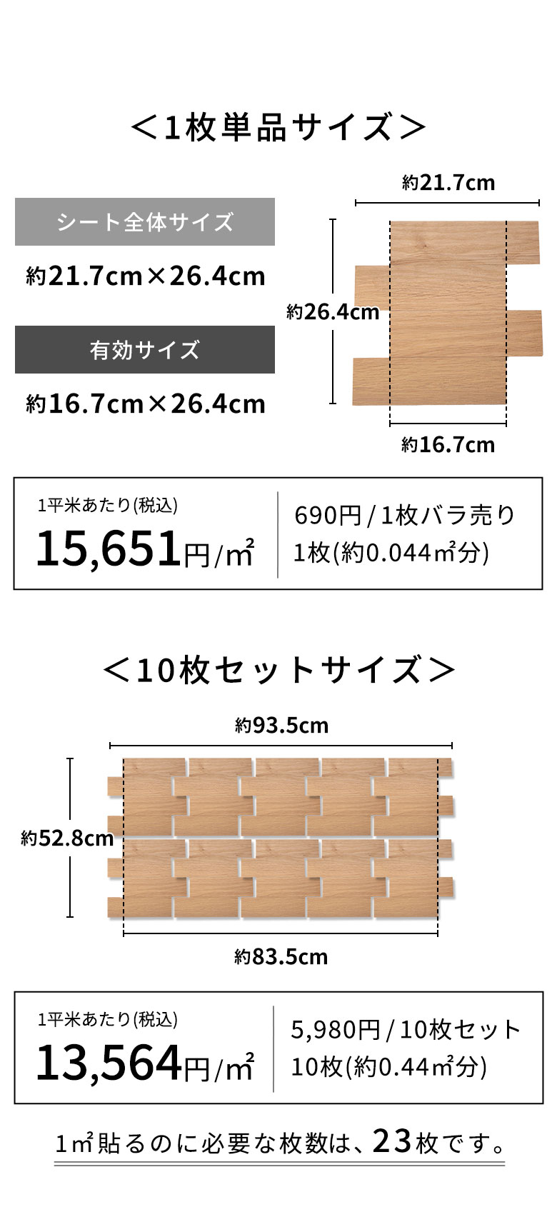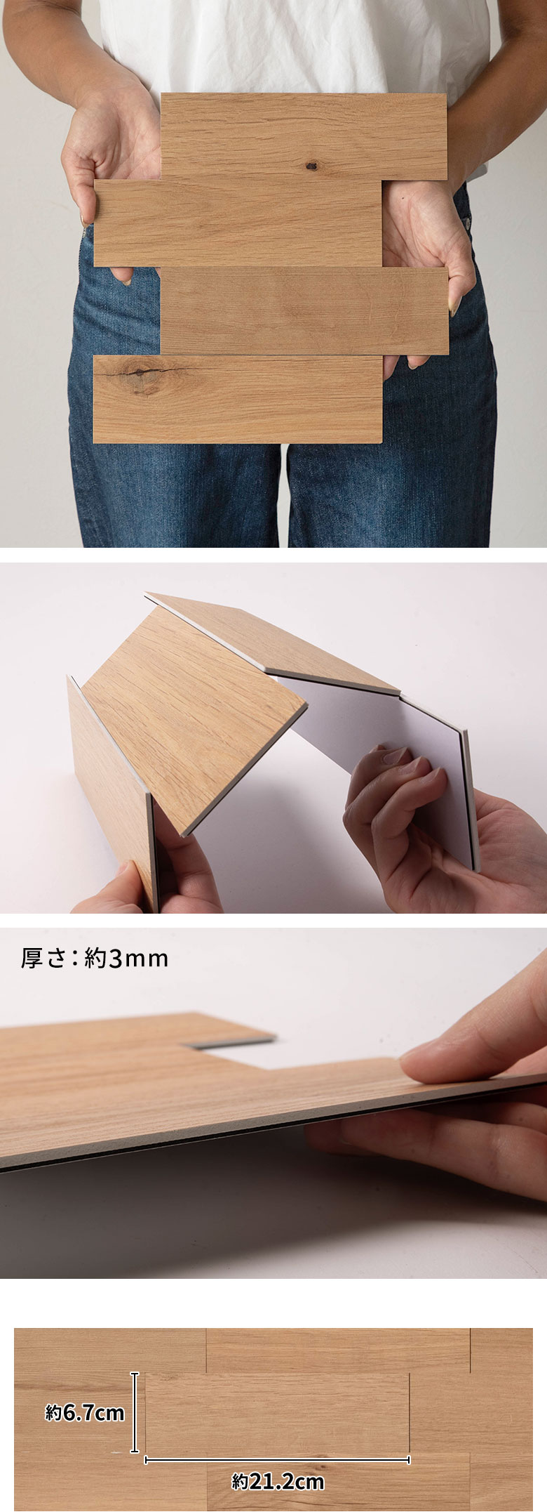 1枚あたり約300gの軽量設計は、施工時の負担を軽減し女性やDIY初心者でも扱いやすいのが特長。表面には、水や汚れに強いPVC素材を採用しお手入れも簡単。