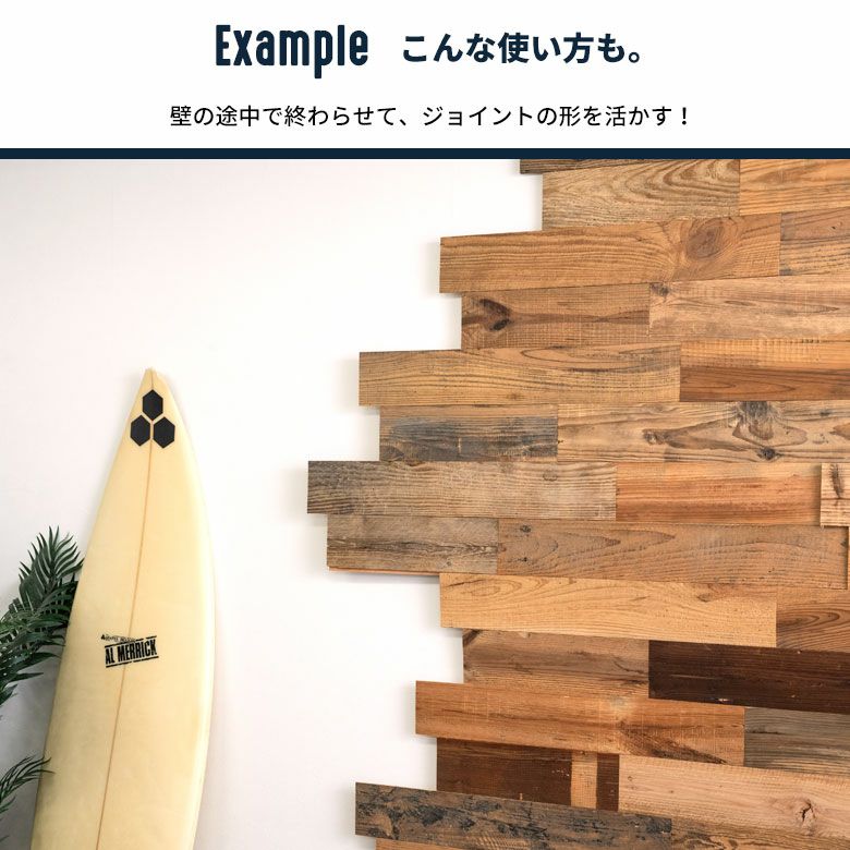 古材のランダムカラーとジョイントの凹凸で、リズム感が生まれます。