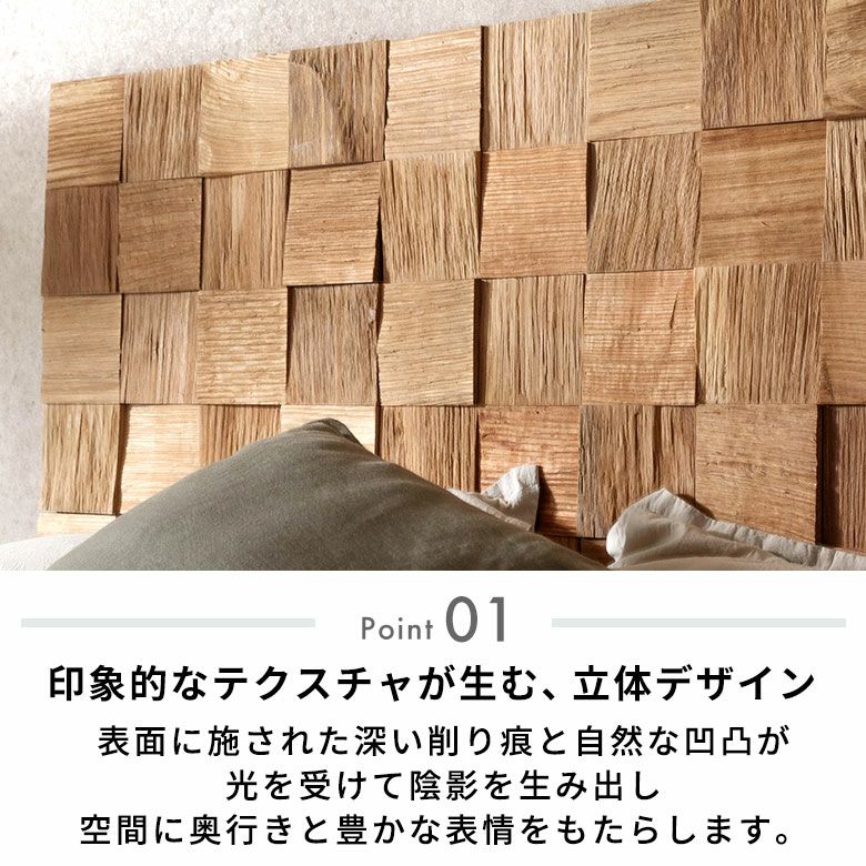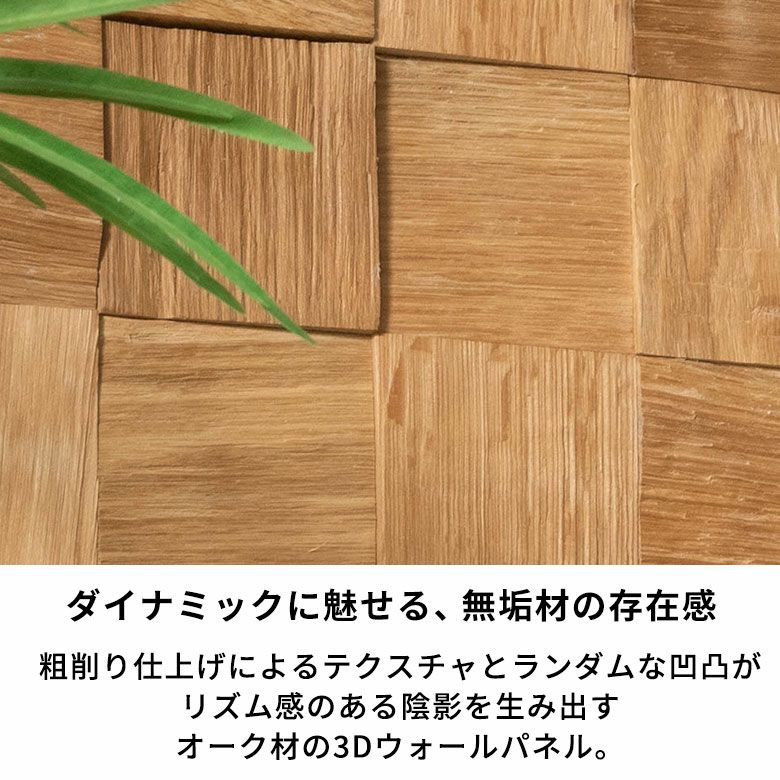 粗削り仕上げによる深い削り痕が、ラフで味わい深い表情を演出。ランダムな凹凸が光を受けて陰影を生み出し、壁面に奥行きと動きを与えます。無垢材の存在感が引き立つデザインです。