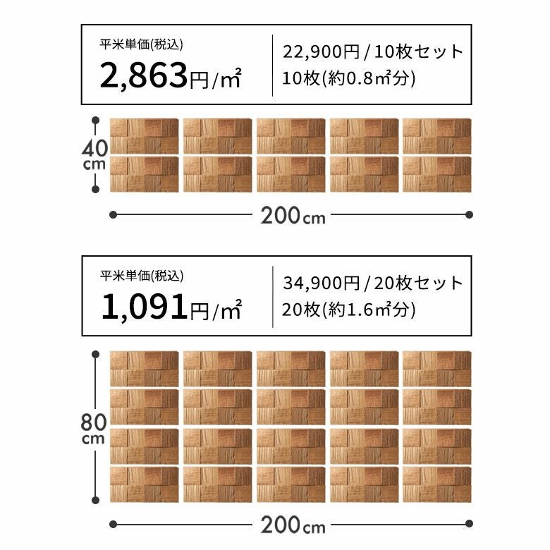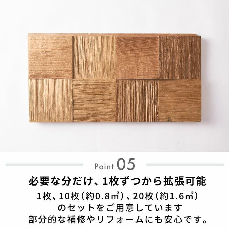 1枚、10枚(約0.8m2)、20枚(約1.6m2)のセットをご用意しています。必要なときに必要な分だけ追加可能。部分的なリフォームや補修にも柔軟に対応できるので、長く安心してお使いいただけます。