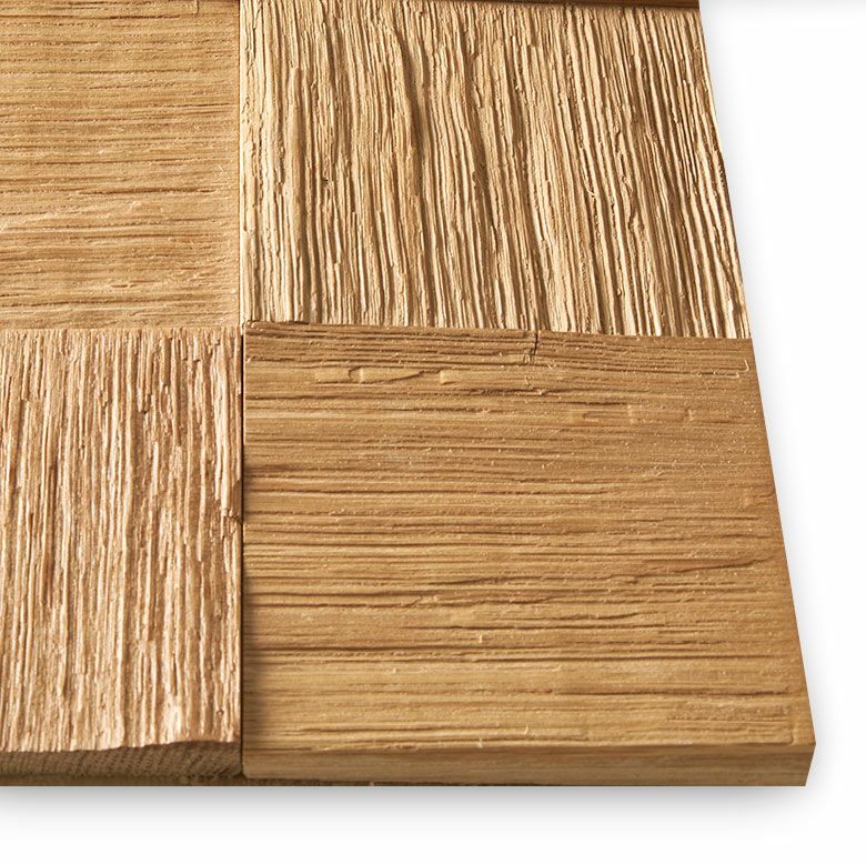 粗削り仕上げによるダイナミックなテクスチャーと、ランダムな凹凸が印象的な「オーク材のウォールパネル」。深く刻まれた削り痕とナチュラルトーンの濃淡が、アートのような空間を演出します。明るいベージュから赤みがかったブラウンまでのグラデーションは、アジアンテイストやバリ風インテリアにもぴったり。