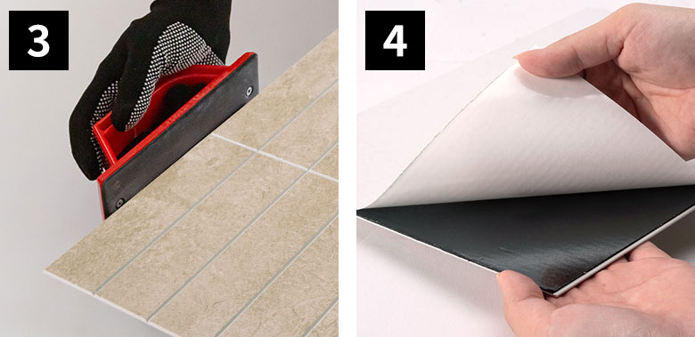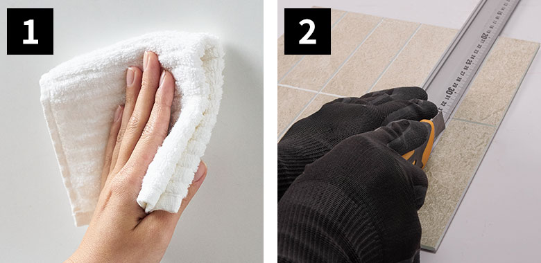 貼るスペースに合わせてカットが必要な場合は、初めにタイルの目地部分をカットしてください。 |