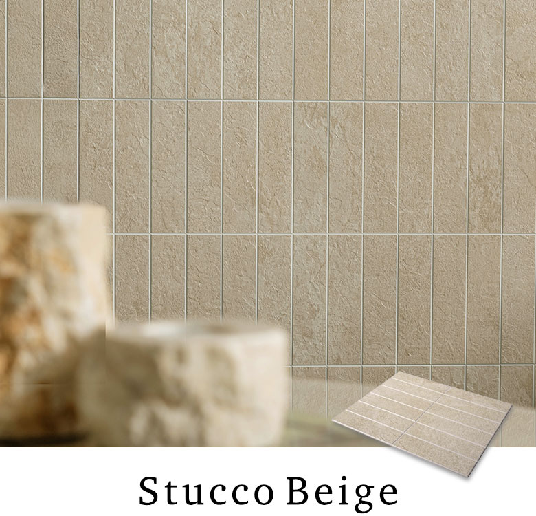 自然な風合いのスタッコ調テクスチャ。不均一な凹凸感が塗り壁風のラフな質感をリアルに再現。やさしく上品なベージュカラーは、どんなインテリアにもなじみやすい万能色。
